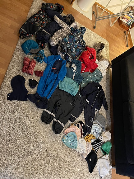 Under vintern är det viktigt att hålla de små varma med rätt kläder: ulliga heldräkter, sockor, vantar, mössor och ytterkläder. En overall är ofta snabbare att ta på än separata jackor och byxor, och snön har svårare att tränga in. I annonserna bör du kolla skicket på ytterkläderna, till exempel hur bra muddar och ben kan justeras, om det finns många reflexer och om kläderna är vattentäta.