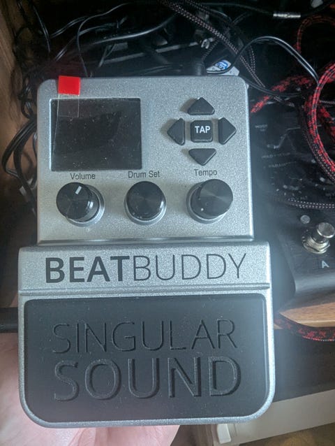 Boss och Mad Professor gitarrpedaler på pedalbord med nätdel