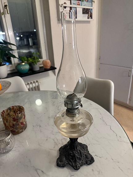 Antik oljelampa med glasbehållare och vacker järnfot