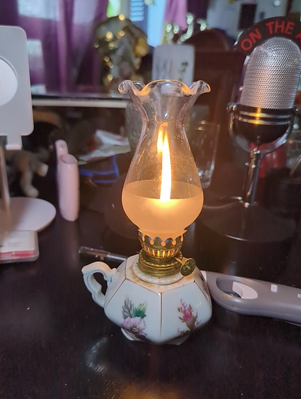 Oljelampa porslin vit med blommotiv och glasglob