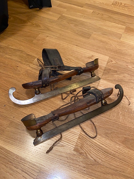 Okänt märke antika träskridskor med läderremmar