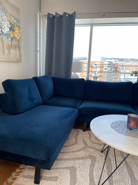 Hörnsoffa + fåtölj i blå sammet