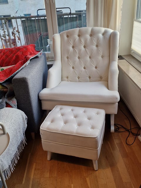 750 krAntik amerikansk gungstol med vitmålad träram och rött tyg med klädda armstödSvenstavik3 dagarLägg till i favoriter.
