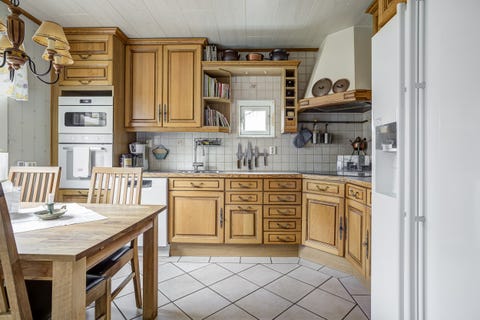 Kök med träskåp och vitvaror