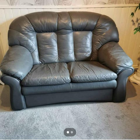 Skinnsoffa grå tvåsitsig Bortskänkes