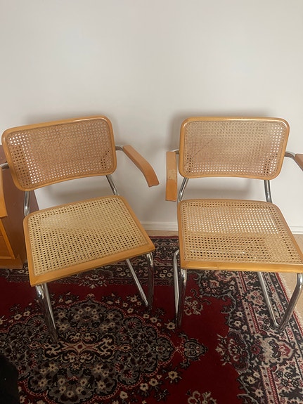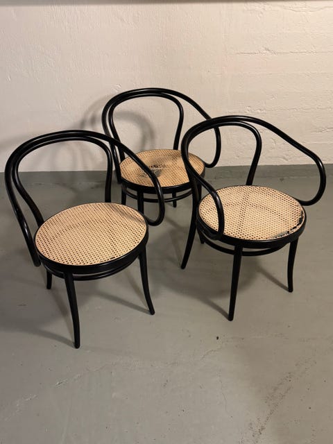 Tre stycken vita korgstolar.