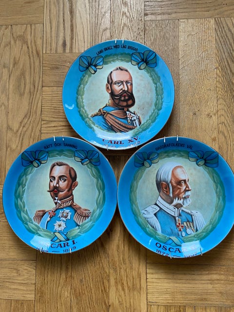 250 krMinnestallrikar med porträtt av Oscar II, Carl XV och Oscar ISundsvall30 janLägg till i favoriter.