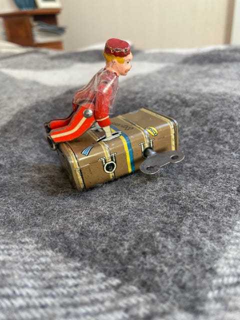 Plåtleksak resenär med resväska uppdragbar Pico