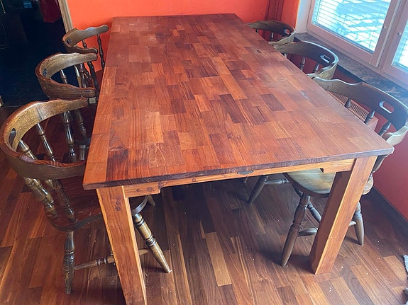 Rustikt träbord med 6 stolar
