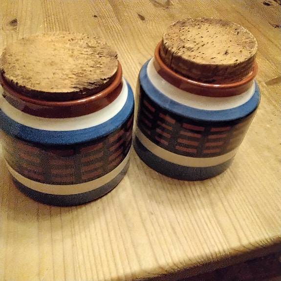 70 krTvå burkar i keramik med korklock. Burkarna är färgade i blå brun och vittBorlänge18 febKöp nuLastbil i rörelseKan skickasLägg till i favoriter.