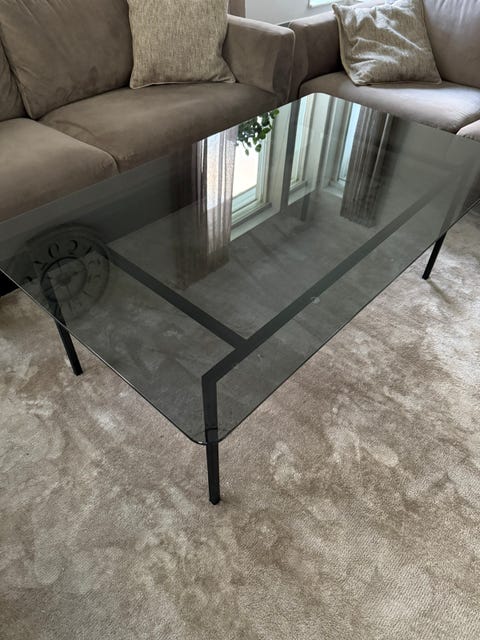 Tv-bänk, svart med mörktonade glasrutor, låsbar med hylla.