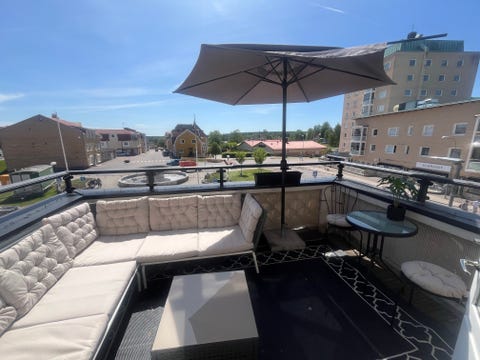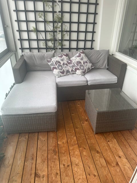 5 000 krUtemöbelset med hörnsoffa, rottingbord, grått parasoll och svart cafesetFagersta2 janLägg till i favoriter.