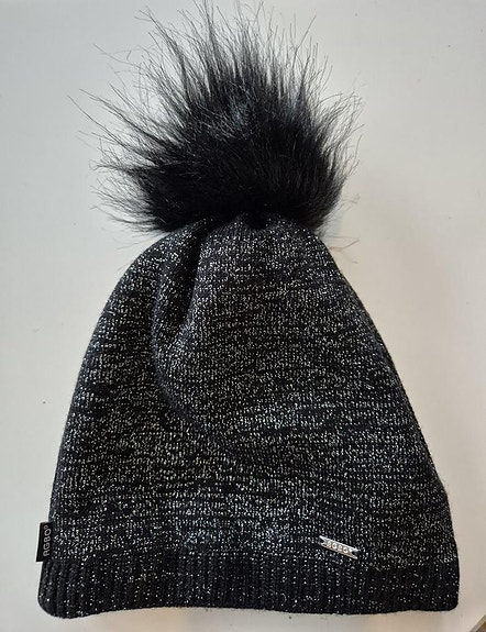 Snygg svart glittrig mössa med tofs i fuskpäls.