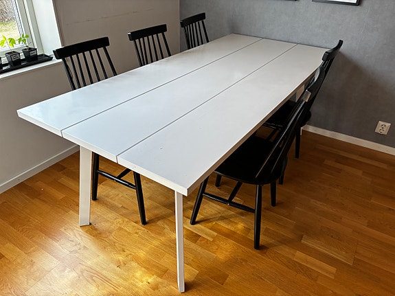 Stilrent matbord med iläggsskiva + bekväma stolar
