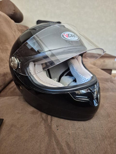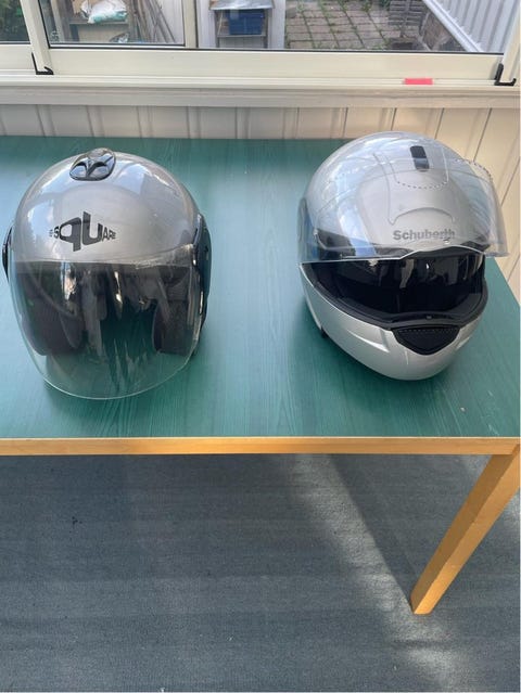 Begagnade motorcykelhjälmar och hjälmhuvor