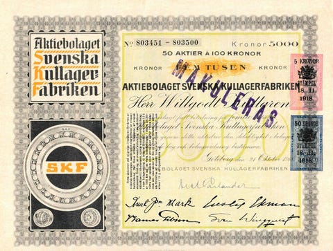 240 krAktiebrev (grönt) Svenska Kullagerfabriken (SKF) 1918 5.000Stockholm10 oktLägg till i favoriter.