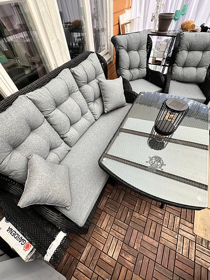 10 000 krUtegrupp med soffa, fåtöljer och glasbord i rottingstil gråHallstavik1 dagLägg till i favoriter.Öppna annons