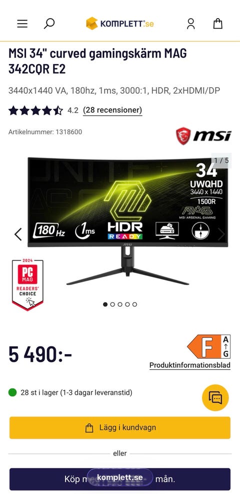 2 900 krOanvänt MSI MAG 342CQR E2 34 tum 180HzTumba10 febGratis frakt•Köp nuLastbil i rörelseKan skickasLägg till i favoriter.