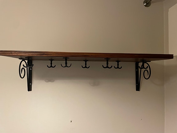 Lång vägghylla i trä med metallkonsoler