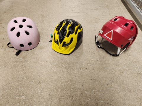 100 krhjälm, cyckelhjälm, hockeyhjälm, Tre hjälmar i storlekarbarn 4 till 8 årÄlvsjö23 novLägg till i favoriter.
