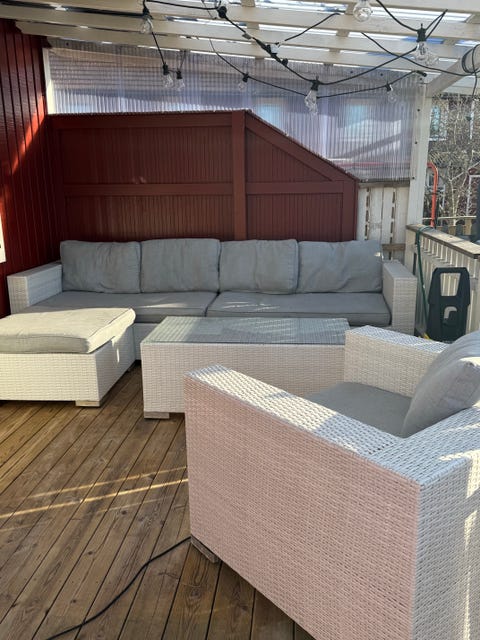 6 000 krVit hörnsoffa i konstrotting med fåtölj och bord för uteplatsGävle, Gävleborg3 dagarLägg till i favoriter.Öppna annons