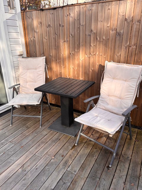 500 krUtemöbelset bord och 2 stolar med dynorBotkyrka, Stockholm14 aprLägg till i favoriter.Öppna annons