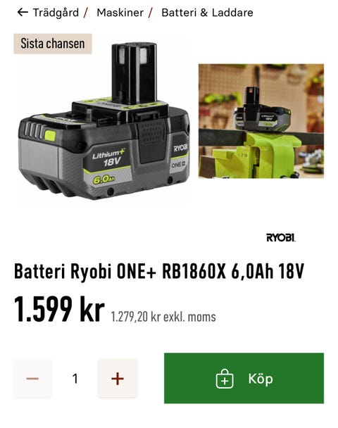 1 100 krRyobi ONE+ RB1860X batteri 6,0Ah 18VSkarpnäck4 timGratis frakt•Köp nuLastbil i rörelseKan skickasLägg till i favoriter.Öppna annons