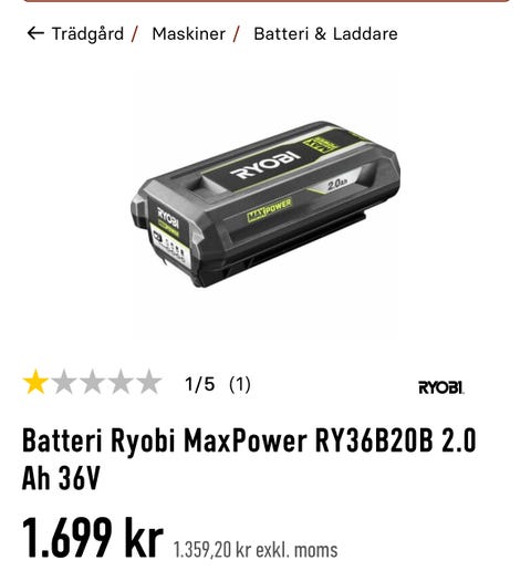 1 100 krRyobi MaxPower RY36B20B batteri 2.0 Ah 36VSkarpnäck4 timGratis frakt•Köp nuLastbil i rörelseKan skickasLägg till i favoriter.Öppna annons