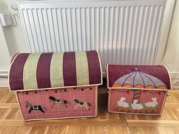 Genom att köpa begagnade leksakslådor och annan förvaring kan du ofta göra ett fynd, och samtidigt kan du skaffa fler lådor och bestämma tillsammans med barnet vilka leksaker som ska ligga i vilken låda. Det finns många olika lösningar för förvaring i barnrummet. Vissa kan skjutas in under sängen, andra har hjul och några kan lyftas upp på en hylla. Förvaring som ska lyftas upp på en hylla bör vara lätt, så att barnet själv kan lyfta dem säkert.
