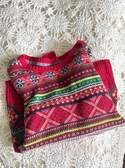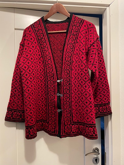900 krRöd kofta, ull, handstickad, norskt mönster, SStl. SSaxtorp23 febKöp nuLastbil i rörelseKan skickasLägg till i favoriter.