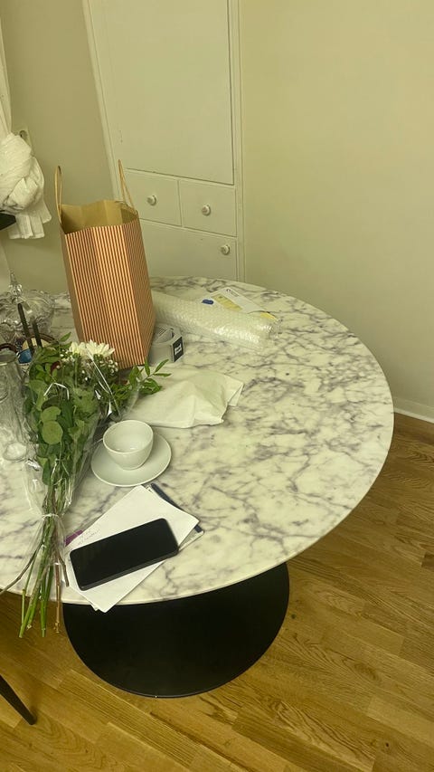 Marmor matgrupp med fyra stolar