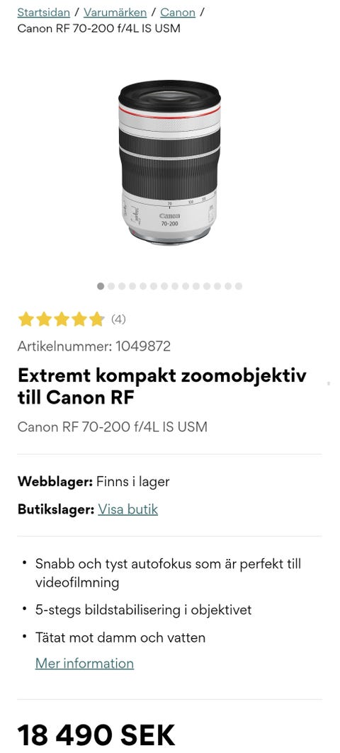 9 000 krCanon EF 70-200mm f/4L ISII USM telezoomobjektiv vit/Canon Adapter EF till RF CanonSkarpnäck23 marKöp nuLastbil i rörelseKan skickasLägg till i favoriter.