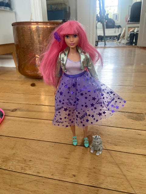 100 krBarbie docka med rosa hår och lila klänning + en katt BarbieSundbyberg4 dagarLägg till i favoriter.