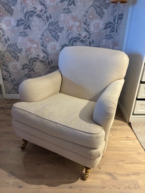 2 000 krLättplacerad fåtölj med hög rygg i sadelgjord och fotpallTrollhättan3 decLägg till i favoriter.