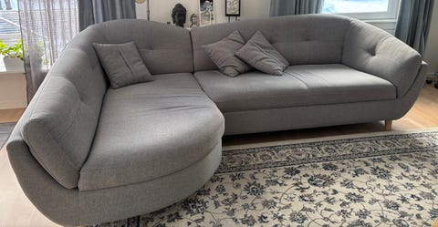 Grå hörnsoffa med kuddar