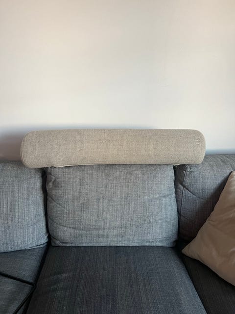 Beige bäddsoffa med två kuddar