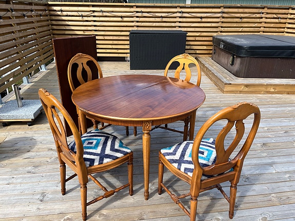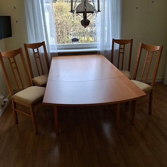 1 500 krMatgrupp- bord med inläggsskiva, 4 st stolar och 4 sittdynor MioSävedalen5 dagarLägg till i favoriter.