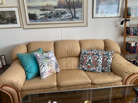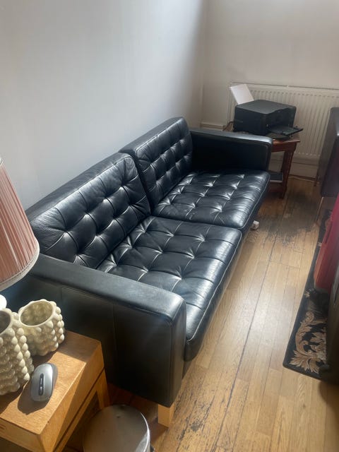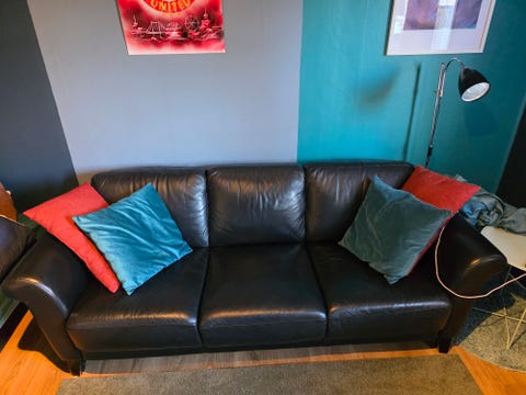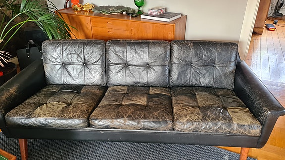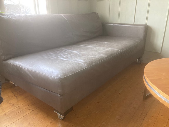 Sliten skinnsoffa - bortskänkes
