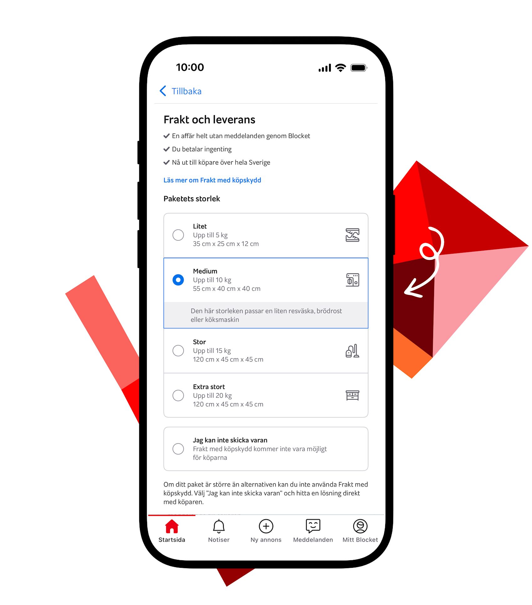 Väg paketet och välj paketstorlek när du skapar annonsen. Vill du sälja snabbare? Välj “Köp nu” så kan köpare klicka hem fyndet direkt. Eller varför inte bjuda på frakten? Kostnaden dras då av automatiskt innan du får utbetalningen.
